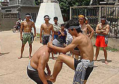 Pradal Serey is traditional Khmer kick boxing. A match consists of five rounds and takes place in a boxing ring. There is a one or two-minute break in between each round. Before a match, boxers perform .