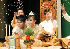 Traditional Cambodian weddings are intricate affairs that consist of multiple ceremonies lasting three days and three nights. The wedding begins with the groom and his family traveling to the bride’s home bearing .